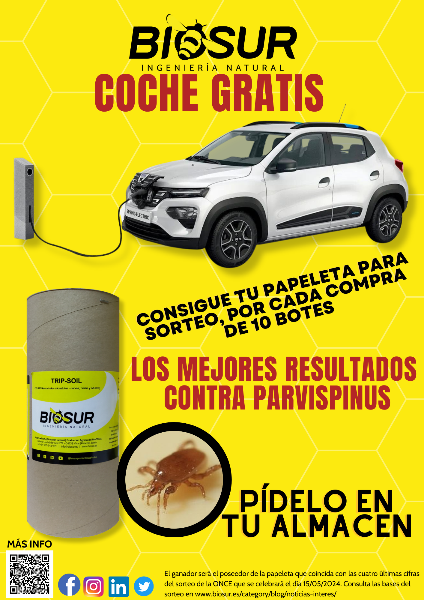 Trips parvispinus es una plaga que está provocando graves daños en los cultivos agrícolas, pero, afortunadamente, tiene un punto débil, ya que su fase de pupa se desarrolla sobre el suelo, siendo ahí en donde TRIP-SOIL, nuestro ácaro depredador, lo estaba esperando para interrumpir DEFINITIVAMENTE su ciclo biológico, pero es que, además, nuestro TRIP-SOIL es 100% eléctrico, ya que con la compra de TRIP-SOIL participarás en el sorteo de un utilitario eléctrico con autonomía suficiente para moverte por tu población y con un cómodo aparcamiento, estando próximamente estacionado en Infoagro 2023.